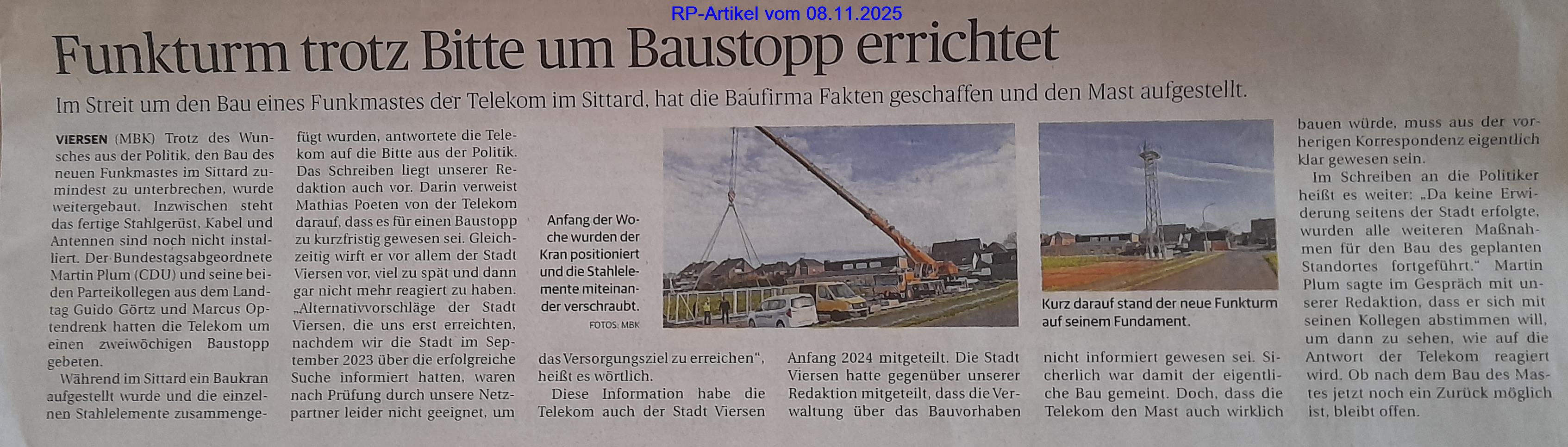 Passend zur Fortsetzung der Bauarbeiten - Errichten des Funkmastes - am 03.11.2025 erschien dieser Artikel in der RP