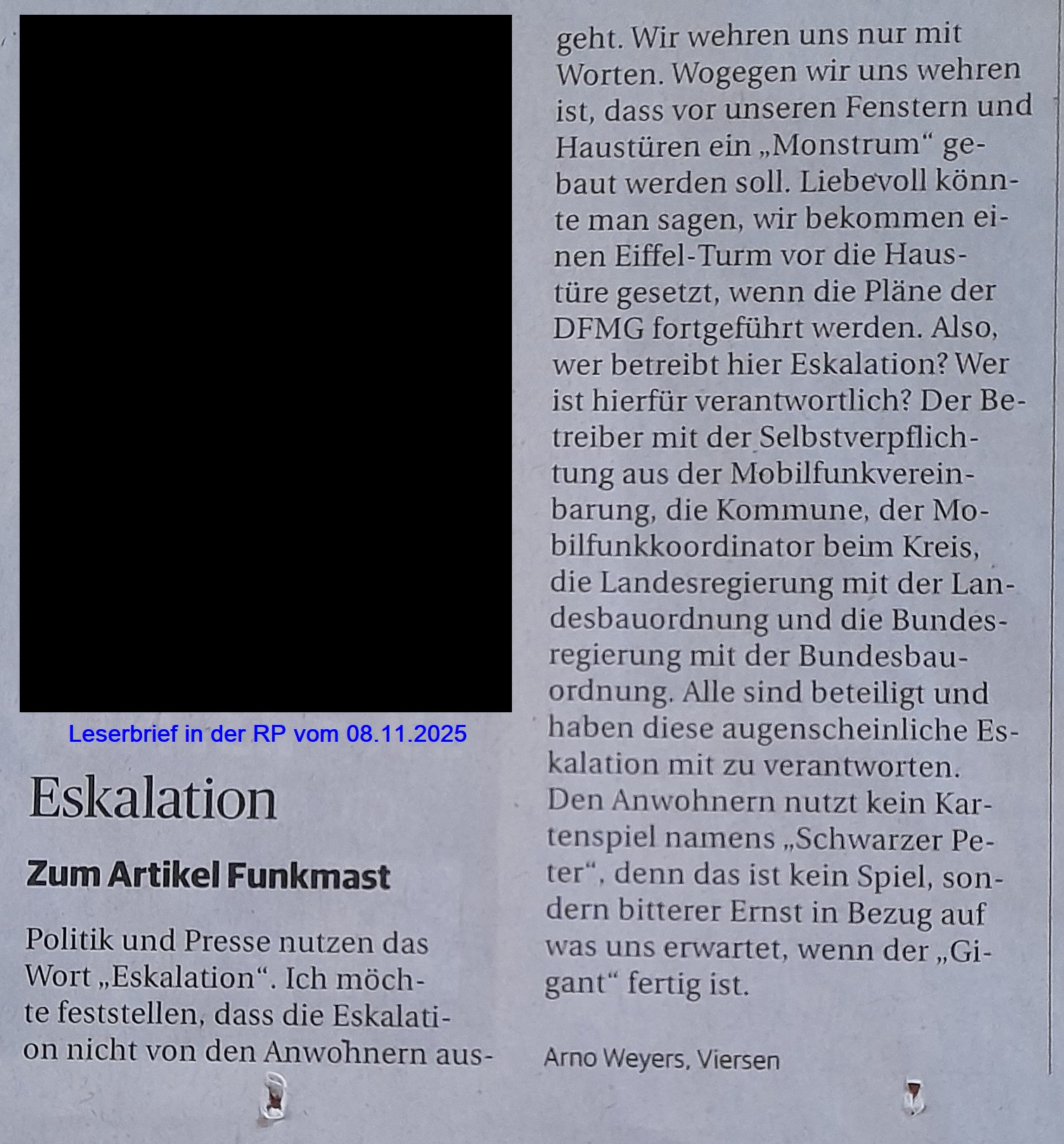06.11.2025: Pressemitteilung über die Errichtung des Funkmastes im Rohbau und den Briefwechsel von Arno Weyers mit dem Bürgermeister Christoph Hopp an WDR-Lokalzeit Düsseldorf - Rheinische Post und Rheinischer Spiegel