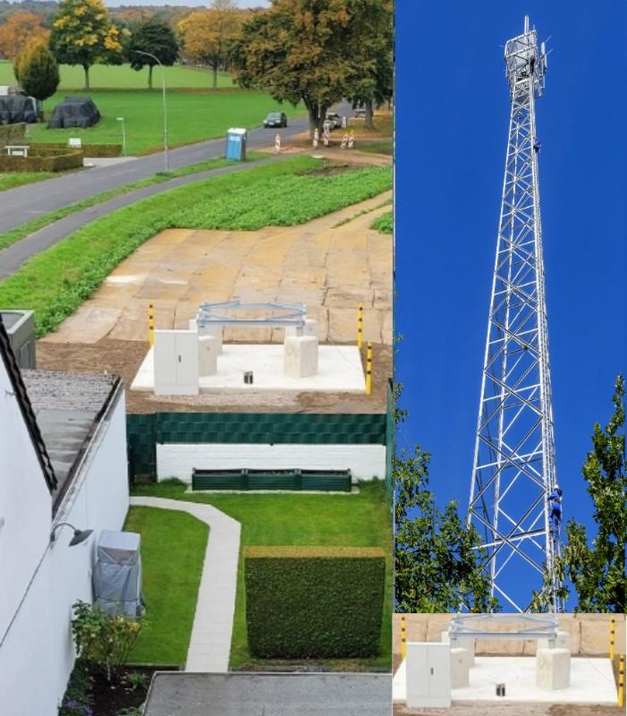 rückwärtiger Blick aus dem Wohnhaus Rheinstraße 82 und eine Fotomontage im rechten Bildteil - ein aus der DFMG-Akquise entnommenes Bild eines Funkmastes wurde verkleinert und auf die Fundamentplatte, die aus dem linken Bildteil herauskopiert wurde, aufgesetzt.