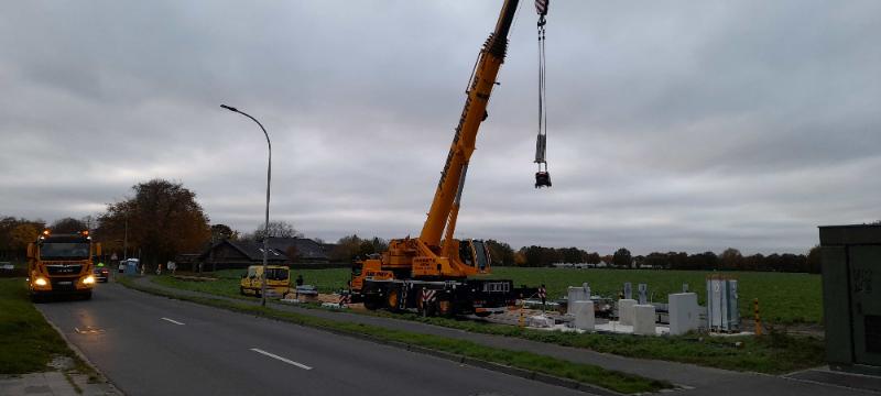 Das linke Bild zeigt den Lastkran, der eine Höhe von 15 Meter hat. Eigene Angaben des Kranführes nach Beendigung seiner Tagesarbeit. Also noch 10 Meter höher, dann passt es doch mit der Fotomontage.