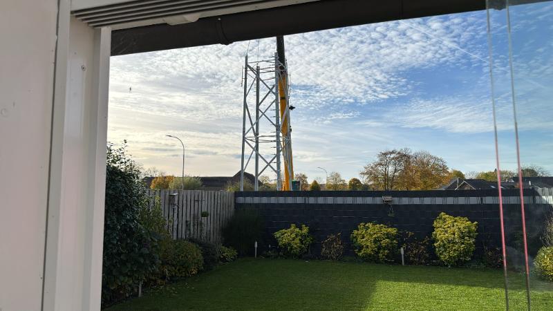 rückwärtiger Blick aus dem Wohnhaus Rheinstraße 82 und eine Fotomontage im rechten Bildteil - ein aus der DFMG-Akquise entnommenes Bild eines Funkmastes wurde verkleinert und auf die Fundamentplatte, die aus dem linken Bildteil herauskopiert wurde, aufgesetzt.