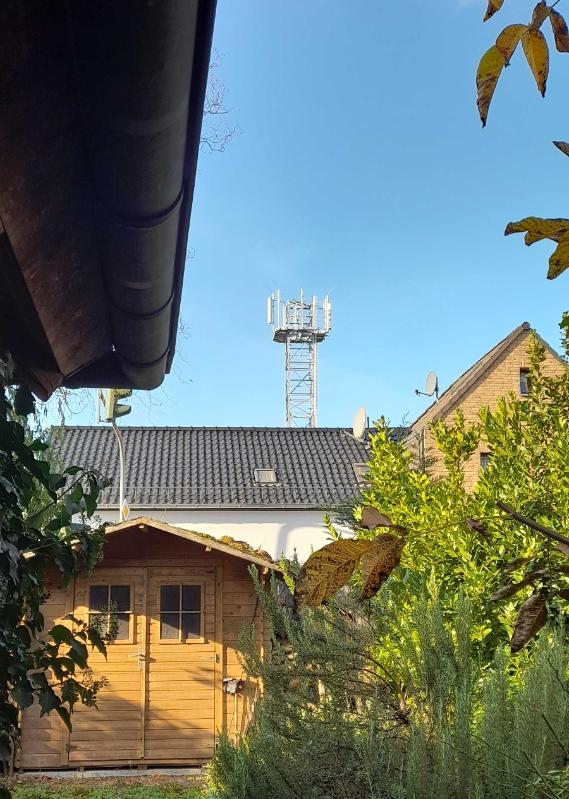 rechts: Der Aufnahme-Standort ist um die Gartentiefe nach hinten verlängert, um den Funkturm insgesamt auf dem Bild zu haben.