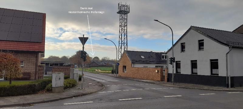 von der Kreuzung Rheinstraße / Mosterzstraße in westliche Richtung, im Hintergrund das Denkmal Ronneshof: