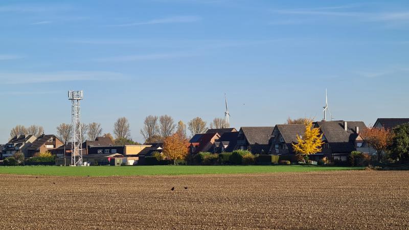 links: Bild aus dem Garten, im Hintergrund eine weitere niederrheinische Hofanlage, unmittelbar hinter dem Zaun ist der Funkturm