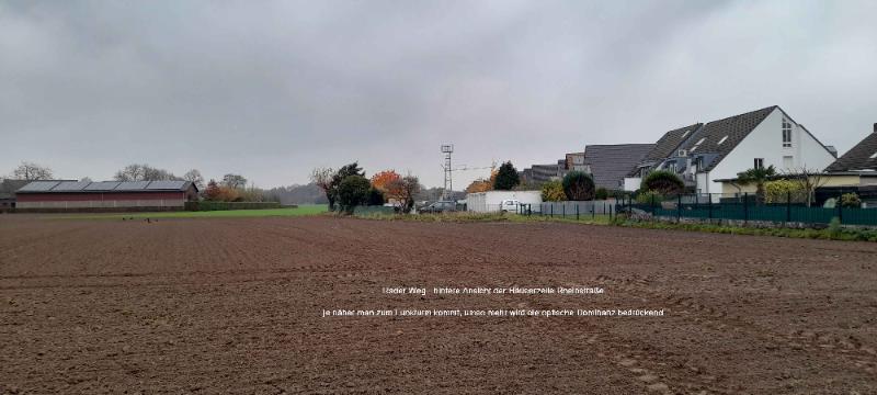 Standort: Verbindungsweg Rheinstraße zur Anne-Frank-Straße am Radweg An der Bahn in Blickrichtung Südosten - Der "Skandalbau" direkt neben Wohngebäuden in einem eigentlich ländlich geprägten Raum mit einer zumeist kleinräumlichen Bebauung und einer denkmalgeschützten niederrheinischen Hofanlage