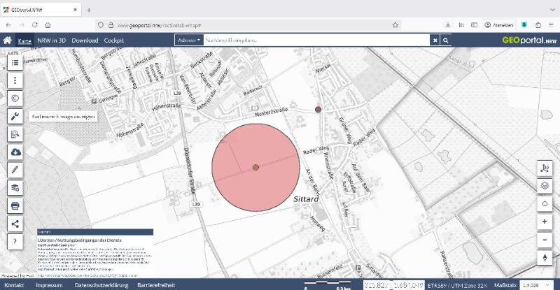 Ausschnitt Geoportal NRW - Der Radius beträgt nahezu 300 Meter Entfernung zu den Bebauungen - Punkt an der Mosterztraße ist der derzeitige Standort