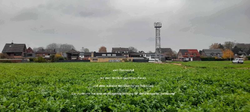 Standort: Ronneshof mit dem ländlich geprägten Raum mit einer zumeist kleinräumlichen Bebauung, Der Funkturm hat eine erschlagende Wirkung für die umliegende Bebauung.