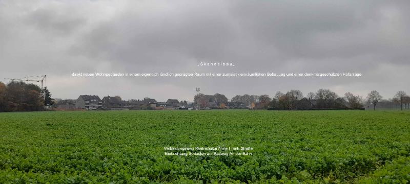Standort: Verbindungsweg Rheinstraße zur Anne-Frank-Straße am Radweg An der Bahn in Blickrichtung Südosten - Der "Skandalbau" direkt neben Wohngebäuden in einem eigentlich ländlich geprägten Raum mit einer zumeist kleinräumlichen Bebauung und einer denkmalgeschützten niederrheinischen Hofanlage