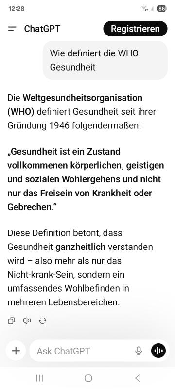 Die Weltgesundheitsorganisation (WHO) definiert Gesundheit seit ihrer Gründung 1946 folgendermaßen: "Gesundheit ist ein Zustand vollkommenen körperlichen, geistigen und sozialen Wohlergehens und nicht nur das Freisein vor Krankheit oder Gebrechen." Diese Definition betont, dass Gesundheit ganzheitlich verstanden wird - also mehr als nur das Nicht-Krank-Sein, sondern ein umfassendes Wohlbefinden in mehreren Lebnsbereichen. Fundstelle ChatGPT: WHO-Definition